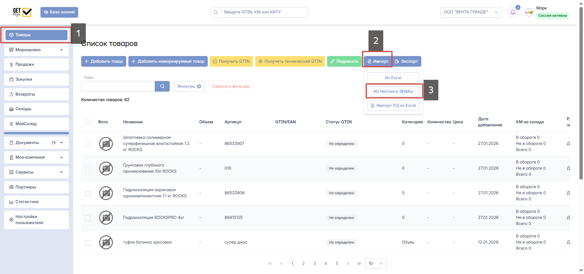 Для синхронизации информации между Честным Знаком и ГетМарк необходимо выполнять процедуру импорта. В процессе импорта обновится информация обо всех товарах и кодах маркировки, которые числятся в вашем личном кабинете Честного знака.