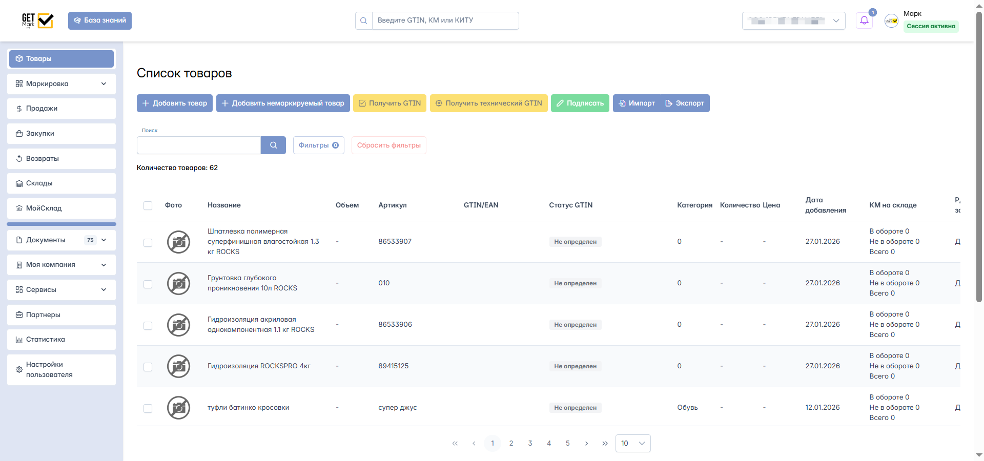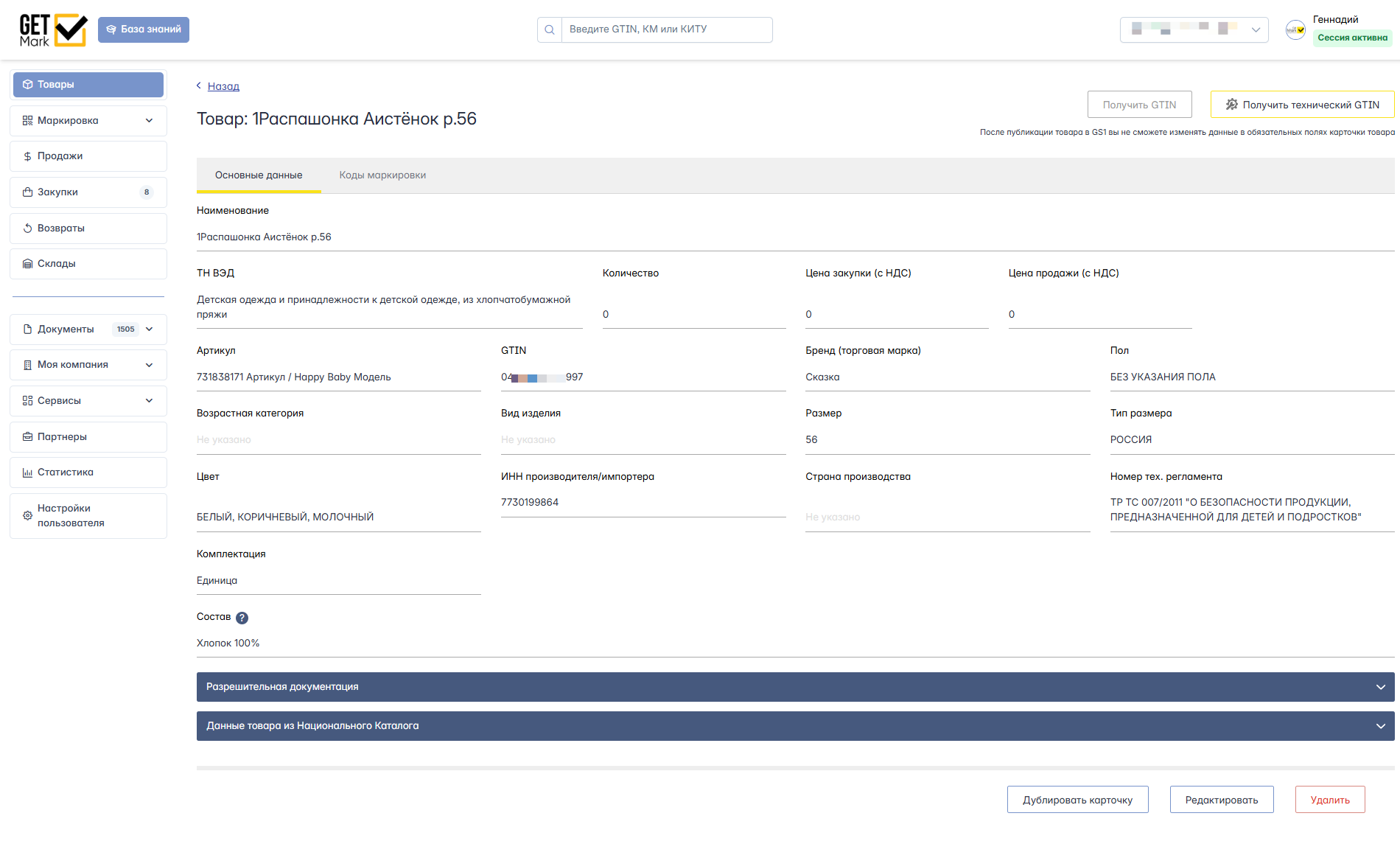 После получения GTIN, карточки спустя несколько часов появятся в национальном каталоге Честного знака (https://markirovka.crpt.ru/login-kep).