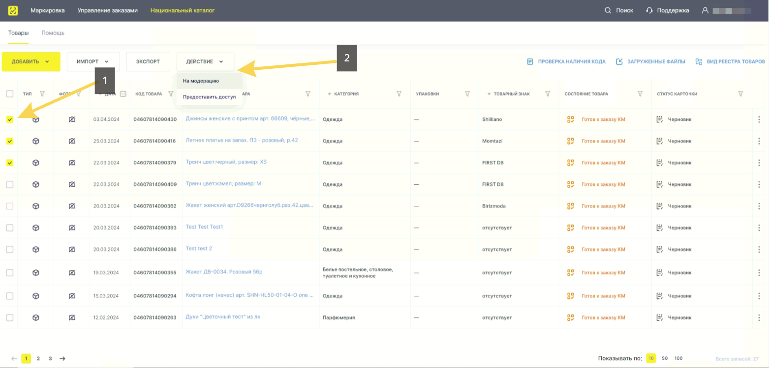 После появления карточек в Национальном каталоге, их необходимо выделить и отправить на модерацию (занимает до 72 часов, без учета выходных и праздничных дней).