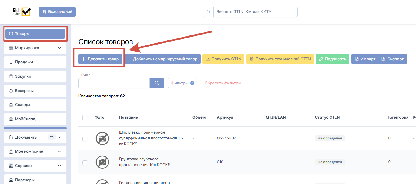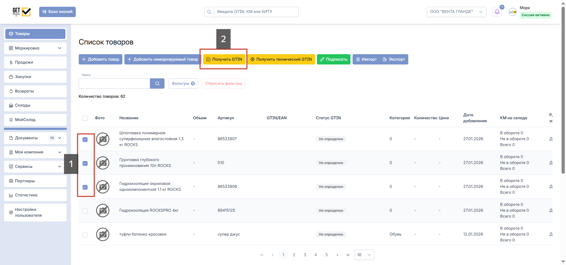 Когда все товары добавлены, выделите их (1) и нажмите "Получить GTIN" (2):