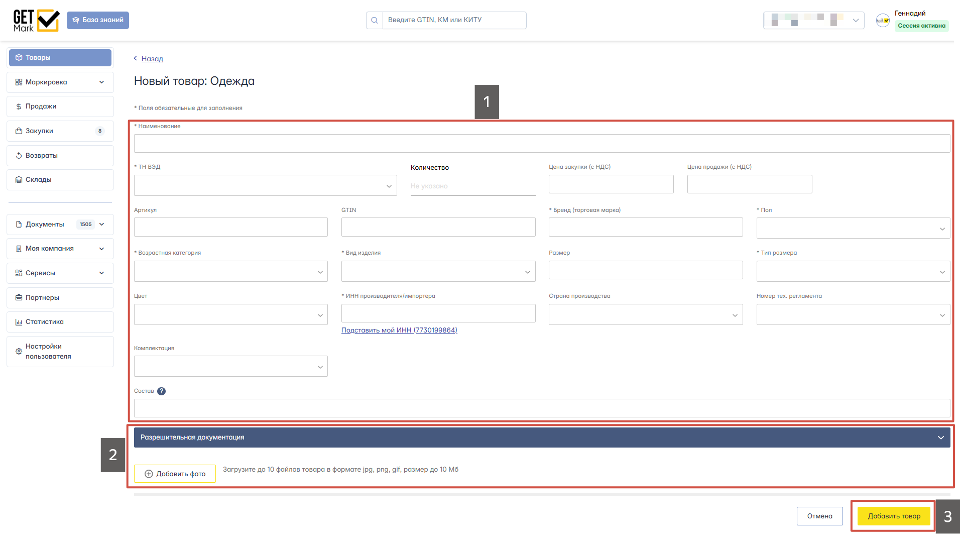 Заполните все возможные атрибуты товара (1), добавьте разрешительную документацию и фото (при наличии) (2) и нажмите Добавить товар (3)