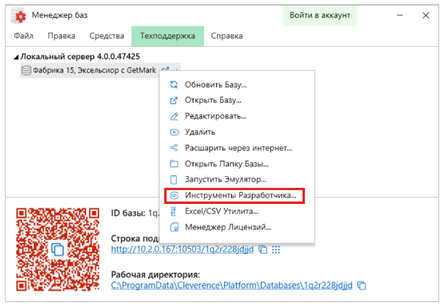 Для того чтобы просто протестировать «Фабрику 15», необязательно устанавливать его на устройство. Можно воспользоваться встроенным клиентом для ПК (менеджер баз → «Открыть» → Открыть клиент для «ПК»).
