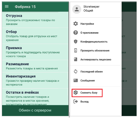 После того как мобильное устройство будет подключится к базе «Фабрики 15», на экране появится главное меню приложения. Далее в процессе работы вы можете переподключиться к другой базе с помощью кнопки «Сменить базу».