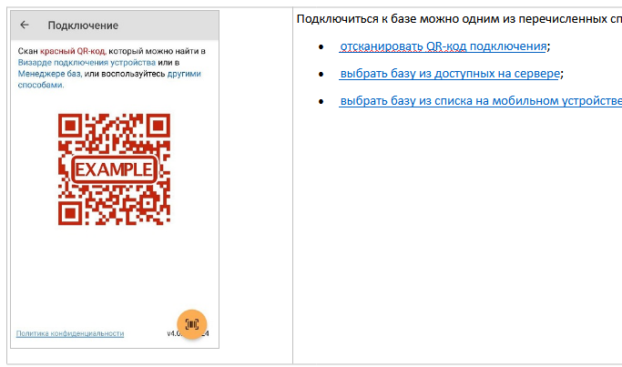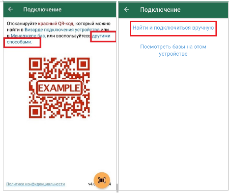 Если ваш ТСД не может считывать 2D штрихкоды, или при сканировании QR-кода возникает ошибка, можно найти нужную базу на сервере и подключиться к ней вручную. Для этого нажмите «Другие способы» → «Найти и подключиться вручную».