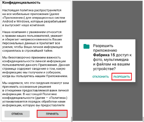 2. Для корректной работы необходимо принять политику конфиденциальности и предоставить приложению все требуемые разрешения.