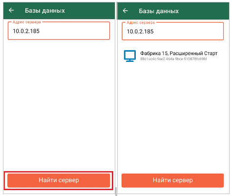 Введите IP-адрес ПК, на котором установлена база «Фабрики 15» (можно узнать с помощью командной строки) и нажмите «Найти сервер». Если адрес верный, на экране ТСД появится список баз, установленных на сервере.