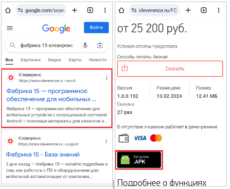 Откройте любой браузер на вашем ТСД, и введите в поисковую строку «клеверенс» или «фабрика 15». Откройте страницу продукта «Фабрика 15» и скачайте установочный файл на ваш ТСД с помощью кнопки «Загрузить .APK».